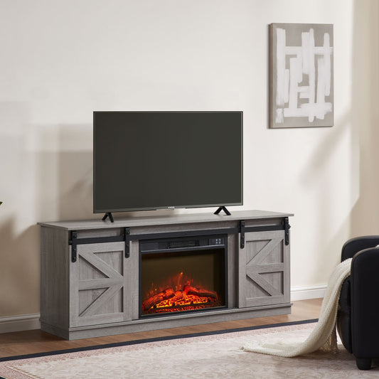 AENKYO 58" Farmhouse TV Stand with Electric Fireplace, Sliding Barn Doors & Adjustable Shelves, Fits TVs up to 65", White