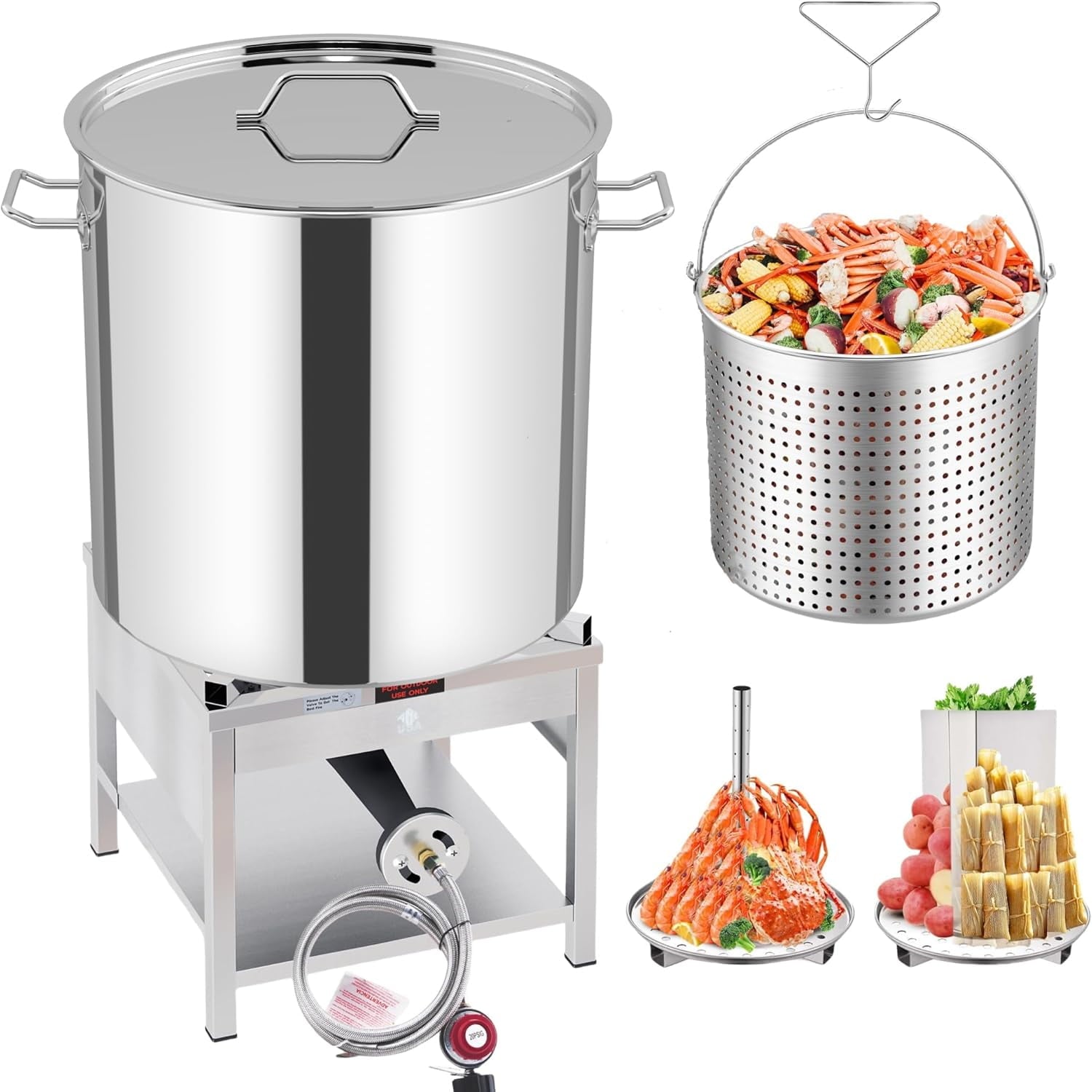 Premium stainless steel construction for long-term durability. 200,000 BTU output burner for versatile outdoor cooking needs. Ideal for seafood boil pot and turkey fryer burner. Multifunctional seafood boil pot with basket strainer and hook for safe food handling. Designed for turkey frying and other outdoor cooking needs. Steaming capabilities with dividers, steam tubes, and racks for even heating. Great for seafood and tamale steaming. Convenient package includes stainless steel propane burner, hose, 100 quart pot, basket, divider, hanging hook, steamer tube and steamer insert rack. Your complete package includes: stainless steel propane burner, hose, 100-quart pot, basket, divider, hanging hook, steamer tube, and insert rack—everything you need for an all-in-one outdoor cooking