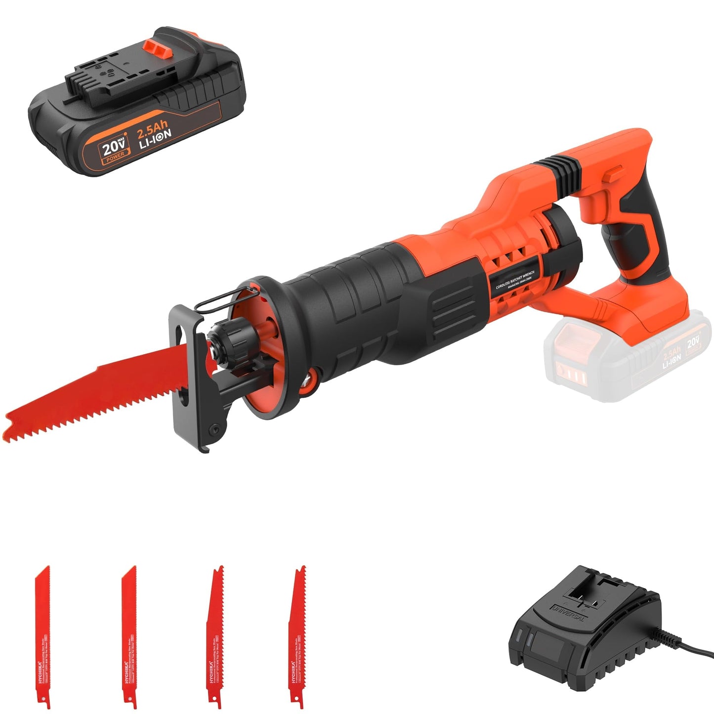 1. 2800 strokes per minute, effectively increasing cutting efficiency; 2. Maximum cutting depth of wood 100mm, metal 6mm; 3. Equipped with two saw blades, the quick-change design facilitates saw blade replacement and installation; 4. 2.5Ah large-capacity battery pack to meet long-term battery life requirements; 5. 2.0ah fast charging charger, the battery pack only takes about 1 hour to fully charge.