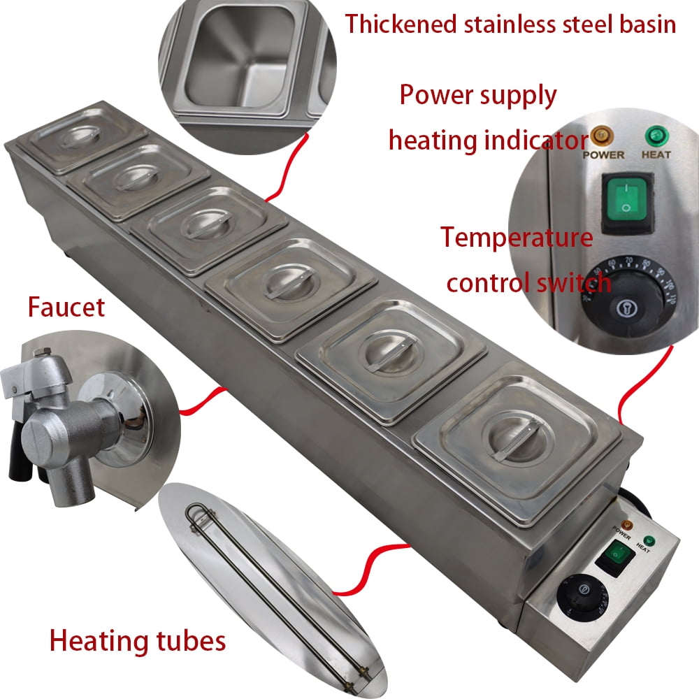 This exciting new bain-marie is constructed with very thick high quality stainless steel. It provides high-efficiency performance and is equipped with a thermostat for easy temperature control. Extremely reliable, easy to use. This machine has six pots, 6" deep. Ideal for restaurants, hotels, banquet halls and cafeterias but will still work great around the home or catering.