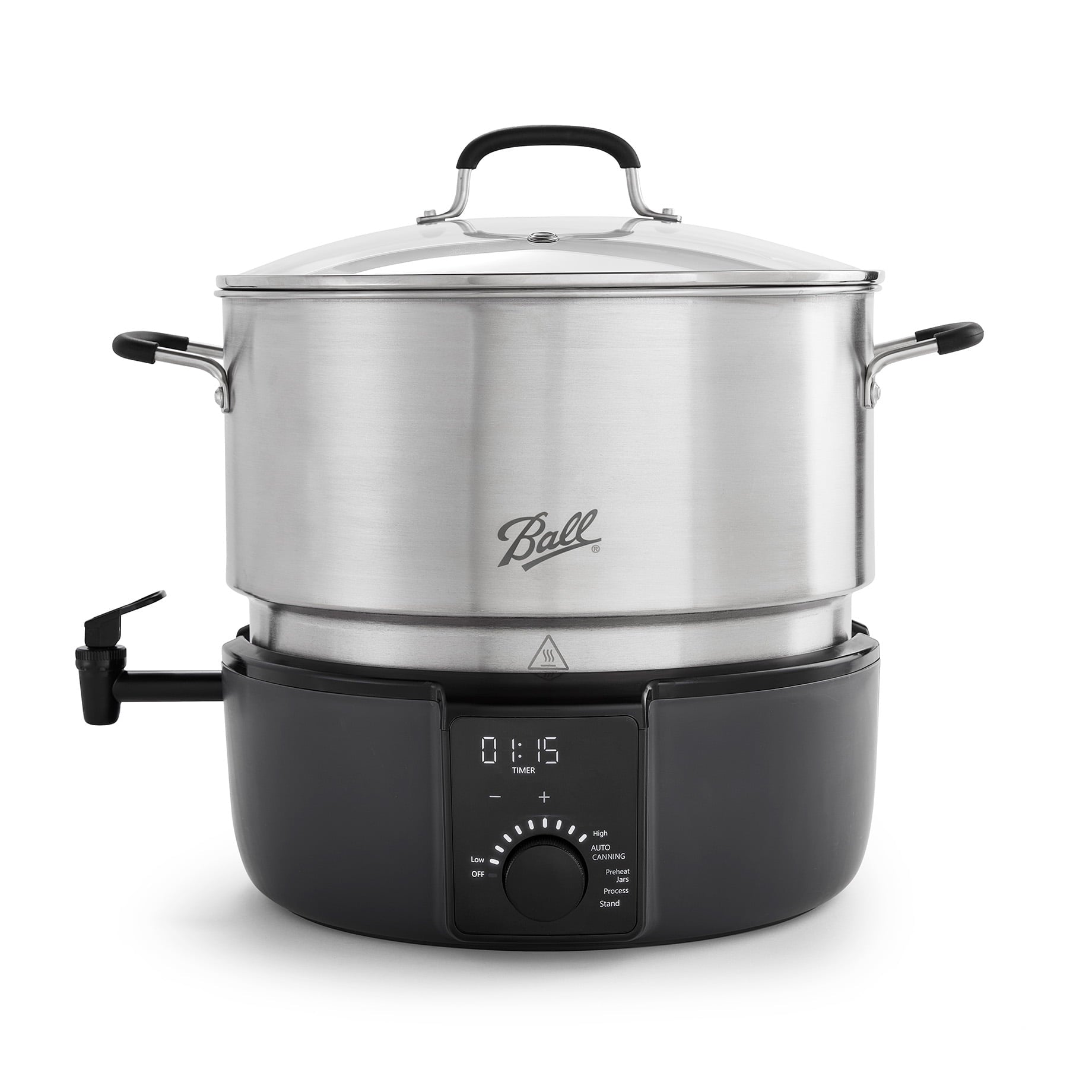Free up time and space on the stovetop with the Ball EasyCanner. Just fill the freestanding canning pot with water and jars of your favorite canning recipes, set the timer, and relax as it takes care of the rest. The pre-programmed Press & Forget technology automates preheating and processing steps with heat sensors that maintain optimal temperatures for consistent results every time while eliminating the time-consuming need to watch the pot.* The 21-quart capacity fits up to 8 pint-size or 7 quart-size jars. When finished, use the spigot for mess-free draining into your sink, and add the lid, rack, and steam tray to the dishwasher for easy cleaning; pot is hand-wash only. Comfortable handles make it easy to lift and tuck away when not in use. Plus, canner includes multicooker and steamer functionality that’s perfect for cooking pastas, soups, vegetables, and seafood, making it the essential all-in-one tool for new and experienced canners alike. *Do not leave appliance unattended.