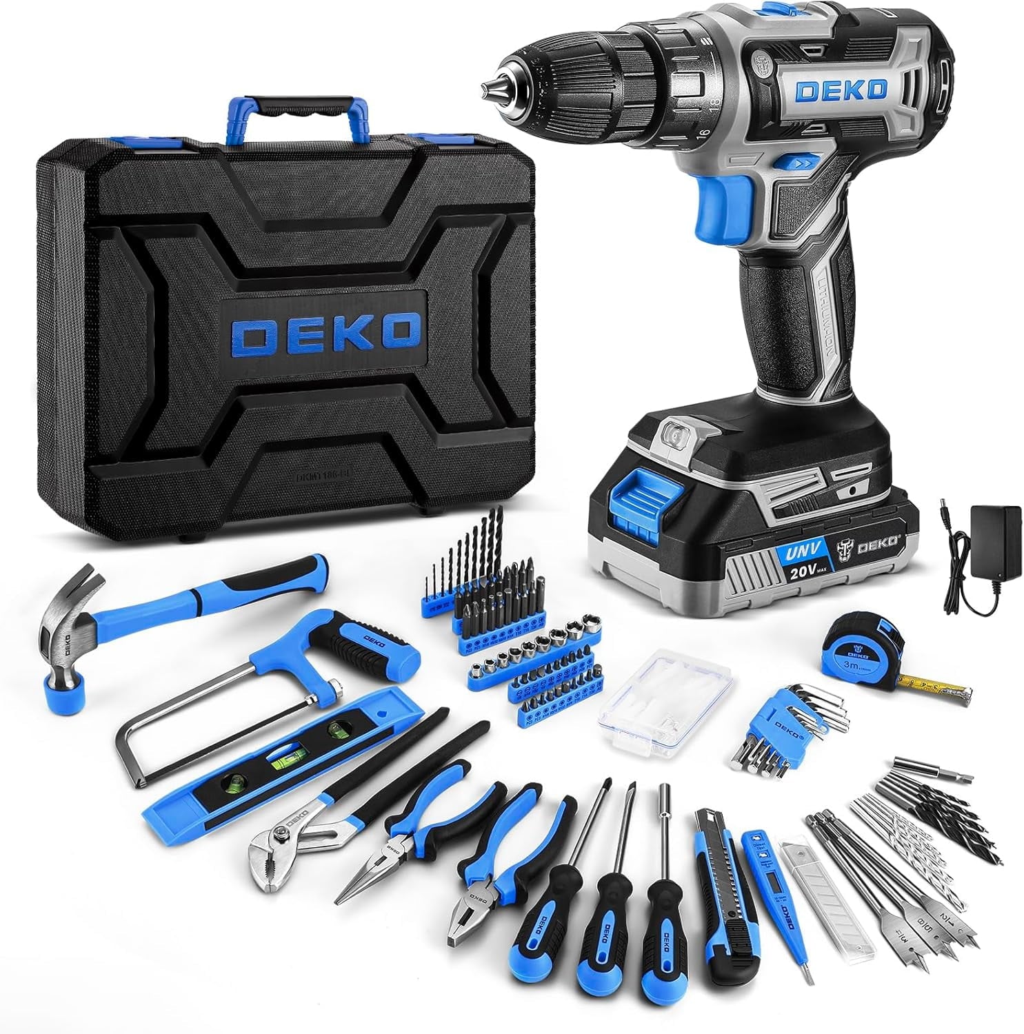 - 【ALL TOOLS IN ONE TOOLBOX】This household tools kit contains the most useful and necessary tools in one box storage as the origanizer of tools sets: 20V battery power drill set and combo kit, screwdrivers, saw, hex key, bits, sockets, drive spinner handle, tape measure, claw hammer,hammer cap,adjustable wrench, level, pliers set and plastic toolkit case etc.